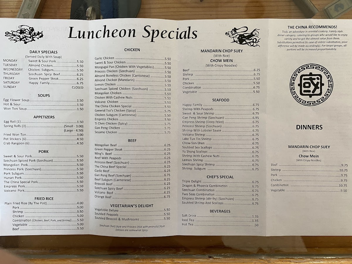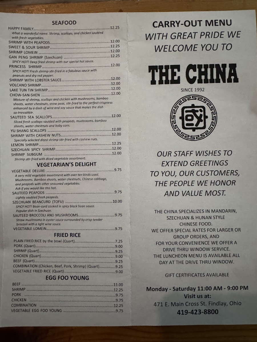 The China offers a straightforward and comforting menu that suits a casual dining setting in Findlay. The selection features classic Chinese favorites that are familiar and satisfying, making it an easy choice for lunch, dinner, or a relaxed takeout night at home.