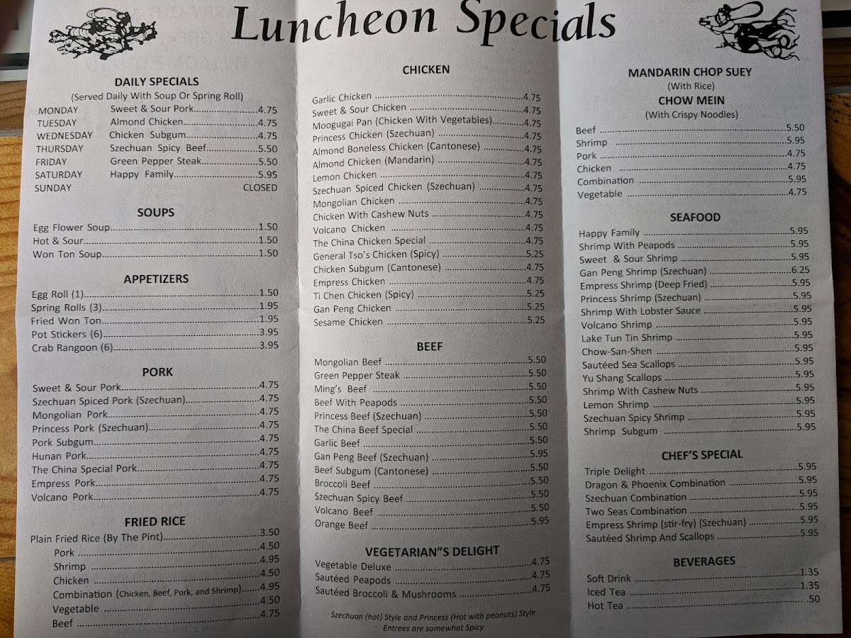 Menu highlights include well-loved options such as General Tso's Chicken, Mongolian Beef, and various chicken dishes like Almond Chicken and Empress Chicken. Alongside these, you’ll find traditional sides like pork fried rice and lo mein, which complement the main entrees with their simple, comforting flavors.